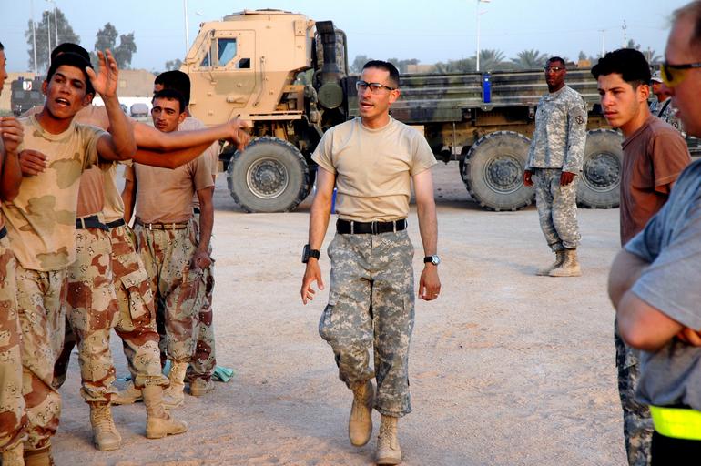 Keywords: Physical Therapists Teach Iraqi Soldiers Physical Fitness DVIDS51906.jpg en Sgt Omar Aponte center a native of Bayamon Puerto Rico a physical therapy technician in Company C 210th Brigade Support Battalion 2nd Brigade Combat Team 10th Mountain Division Light Infantry out of Fort Drum N Y inspects Iraqi soldiers' form as they pass a sandbag for upper body strengthening at the Iraqi army compound in Mahmudiyah Iraq U S Army photo by 2nd Lt Liz Lopez <br>Unit Multi-National Division-Central 2007-08-01 https //www dvidshub net/image/51906/physical-therapists-teach-iraqi-soldiers-physical-fitness 51906 2007-08-02 06 06 MAHMUDIYAH IQ PD-USGov Fort Drum Images from DoD uploaded by Fæ |