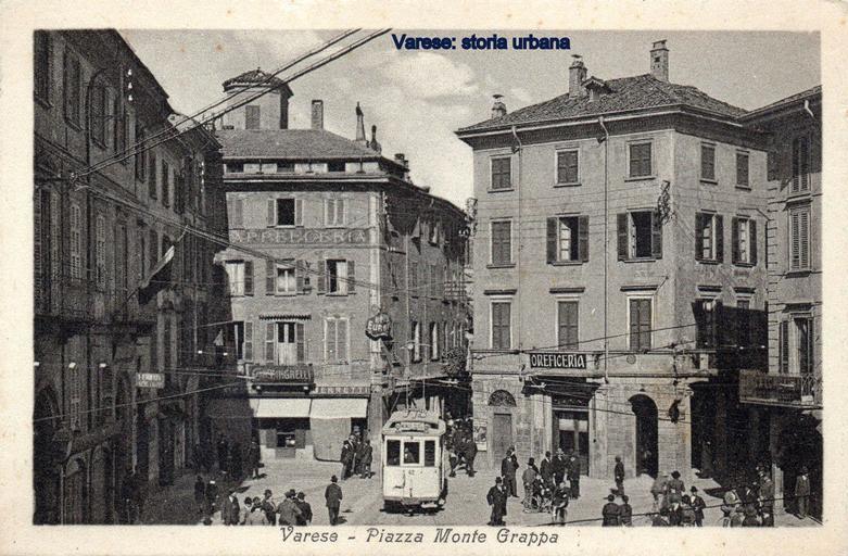 | Keywords: varese tram piazza porcari piazzaporcari via verbano viaverbano via walter marcobi viawaltermarcobi corso vittorio emanuele ii corsovittorioemanueleii corso giacomo matteotti corsogiacomomatteotti piazza monte grappa piazzamontegrappa building architecture photo border outdoor Sulla sinistra, dove sventola la bandiera, casa Carantani già casa Porcari (rimodernata nel 1809 dall'arch. Lorenzo Zuccotti). L'edificio con torretta che ospita la cappelleria e reca l'insegna pubblicitaria dell'hotel Europa di via Sacco verrà demolito nel 1928 per fare spazio a palazzo Verga (ing. Mario Cantù). Tra questo palazzo e casa Cova (all'estrema destra, sostituito dal palazzo R.A.S., ing. Mario Loreti, 1935) è la strettissima via Verbano (ora Marcobi). A destra di casa Cova l'imbocco di corso Vittorio Emanuele II (ora Matteotti) con la casa su portici sostituita nel 1929 da palazzo Mascardi/Pini (ing. Camillo Lucchina). Sulla sinistra, dove sventola la bandiera, casa Carantani già casa Porcari (rimodernata nel 1809 dall'arch. Lorenzo Zuccotti). L'edificio con torretta che ospita la cappelleria e reca l'insegna pubblicitaria dell'hotel Europa di via Sacco verrà demolito nel 1928 per fare spazio a palazzo Verga (ing. Mario Cantù). Tra questo palazzo e casa Cova (all'estrema destra, sostituito dal palazzo R.A.S., ing. Mario Loreti, 1935) è la strettissima via Verbano (ora Marcobi). A destra di casa Cova l'imbocco di corso Vittorio Emanuele II (ora Matteotti) con la casa su portici sostituita nel 1929 da palazzo Mascardi/Pini (ing. Camillo Lucchina). |