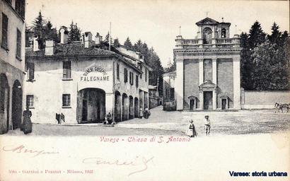 Keywords: Piazza Sant'Antonio (ora della Motta). A destra della chiesa di Sant'Antonio (arch. Giuseppe Bernasconi, 1613-14) il muro continuo di villa Mirabello chiude ancora la piazza. Le case porticate a sinistra occupate della falegnameria Bianchi Giuseppe sono state completamente trasformate e rialzate nel 1909. varese |