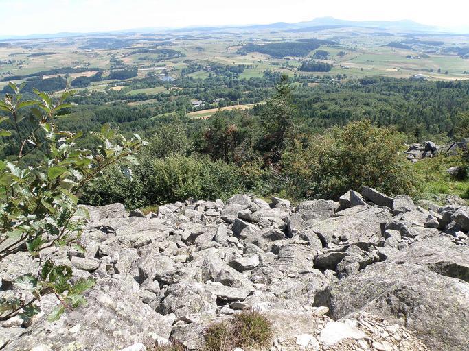 Keywords: Pic du Lizieux4.JPG Araules commune de la Haute-Loire France région Auvergne <br/> Vue prise depuis le pic du Lizieux appelé aussi suc du Lizieux alt 1388 mètres situé dans le sud-est de la commune d ™Araules et dont on voit à l ™avant-plan une pente pierreuse du flanc sud L ™Ã©tang visible dans la plaine en contrebas vers la gauche se trouve à l ™emplacement d ™une ancienne mine ; le groupe de maisons un peu à droite de l ™Ã©tang est le hameau du Bouchat Un peu plus près de nous le hameau de Faurie toitures grises <br/> à l ™horizon le sommet le plus élevé sur la photo et dans la réalité est le mont Mézenc alt 1753m ; à sa droite le mont d ™Alambre alt 1691 Le morne aplati à gauche du Mézenc et plus proche de nous pourrait être le mont Signon alt 1455m comm de Chaudeyrolles <br/> Objectif orienté au sud own Torsade de Pointes 2009-08 Pic du Lizieux |
