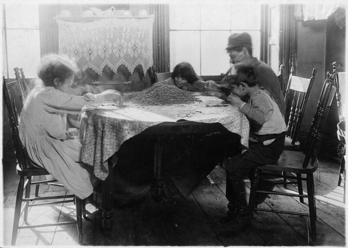 | Keywords: nara:arcid=523284 u.s. national archives usnationalarchives lewis hine lewishine child labor childlabor working conditions workingconditions factory national child labor committee nationalchildlaborcommittee 1910child labor 1910childlabor 1910 blackandwhite monochrome black and white Original Caption: Left to right: Florence Lieto, 10 years old. Jennie Macola, 10 years old. Mamie Macola, 8 years old. Nicholas Macola, 6 years old. Picking off sweepings. The sweepings cost 25 [cents] a sack at the warehouse, and picked over coffee sells at about 12 [cents] a pound. Man working with sore hand tied up in bandage. Children work after school hours and Saturday. New York City, February 1910 U.S. National Archives’ Local Identifier: 102-LH-1301 Photographer: Hine, Lewis Subjects: Child Labor National Child Labor Committee Working Conditions Factory Persistent URL: research.archives.gov/description/523284 Repository: Still Picture Records Section, Special Media Archives Services Division (NWCS-S), National Archives at College Park, 8601 Adelphi Road, College Park, MD, 20740-6001. For information about ordering reproductions of photographs held by the Still Picture Unit, visit: www.archives.gov/research/order/still-pictures.html Reproductions may be ordered via an independent vendor. NARA maintains a list of vendors at www.archives.gov/research/order/vendors-photos-maps-dc.html Access Restrictions: Unrestricted Use Restrictions: Unrestricted Original Caption: Left to right: Florence Lieto, 10 years old. Jennie Macola, 10 years old. Mamie Macola, 8 years old. Nicholas Macola, 6 years old. Picking off sweepings. The sweepings cost 25 [cents] a sack at the warehouse, and picked over coffee sells at about 12 [cents] a pound. Man working with sore hand tied up in bandage. Children work after school hours and Saturday. New York City, February 1910 U.S. National Archives’ Local Identifier: 102-LH-1301 Photographer: Hine, Lewis Subjects: Child Labor National Child Labor Committee Working Conditions Factory Persistent URL: research.archives.gov/description/523284 Repository: Still Picture Records Section, Special Media Archives Services Division (NWCS-S), National Archives at College Park, 8601 Adelphi Road, College Park, MD, 20740-6001. For information about ordering reproductions of photographs held by the Still Picture Unit, visit: www.archives.gov/research/order/still-pictures.html Reproductions may be ordered via an independent vendor. NARA maintains a list of vendors at www.archives.gov/research/order/vendors-photos-maps-dc.html Access Restrictions: Unrestricted Use Restrictions: Unrestricted |