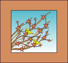 Keywords: picture frame birds two pair love birds sitting yellow tree branches leaves flowers brown blue sky photo prints landscape nature wall decor painting gallery exhibition