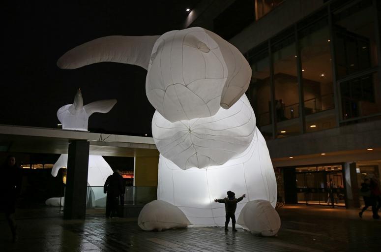 | Keywords: hug rabbit public art publicart London, UK  Large inflatable rabbit sculptures form part of the Southbank Centreâs Winter Festival. The seven metre high inflatable sculptures by Australian artist Amanda Parer entitled Intrude will be on display until January 11, 20 London, UK  Large inflatable rabbit sculptures form part of the Southbank Centreâs Winter Festival. The seven metre high inflatable sculptures by Australian artist Amanda Parer entitled Intrude will be on display until January 11, 20 |