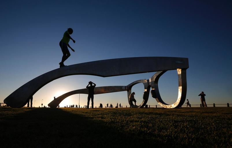 | Keywords: statue sunglasses public art publicart outdoor Cape Town, South Africa Youths pose for photographs as they climb on top of a sculpture in the form of a giant pair of spectacles on Sea Point Promenade. Cape Town, South Africa Youths pose for photographs as they climb on top of a sculpture in the form of a giant pair of spectacles on Sea Point Promenade. |