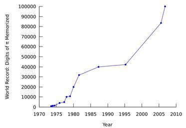Keywords: PiDigits.svg Recent decades have seen a surge in the record number of digits memorized Created with Gnuplot from the following data supplied by User Mebden Around 1973 5 930 1973 81 1110 1973 95 1210 1974 5 1505 1975 93 4095 1977 3 5050 1978 10000 1979 10625 1980 20015 1981 6 31810 1987 3 40000 1995 2 42195 2005 6 83430 2006 81 100000 2008 91 120539 en wikipedia Andrei Stroe CommonsHelper 2007-08-09 Keenan Pepper wikipedia en Keenan Pepper original upload log page en wikipedia PiDigits svg 2007-08-09 17 28 Keenan Pepper 640×440× 134704 bytes <nowiki>Convert all text objects to paths in Inkscape which makes pi symbol render correctly </nowiki> 2007-08-09 17 23 Keenan Pepper 640×440× 6901 bytes <nowiki> Created with Gnuplot from the following data supplied by User Mebden 1973 5 930 1973 81 1111 1973 95 1210 1974 5 1505 1975 93 4096 1977 3 5050 1978 10000 1979 10625 1980 20013 1981 6 31811 1987 3 40000 1995 2 42195 2005 6 8</nowiki> Memorizing Pi English text |
