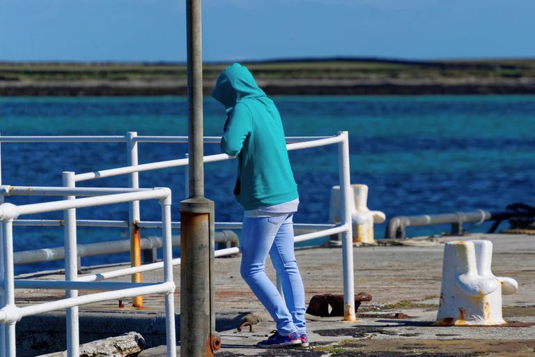 Keywords: pier girl sea young water female relaxed people holiday relax vacation outdoor healthy coastline sky blue island sanday orkney