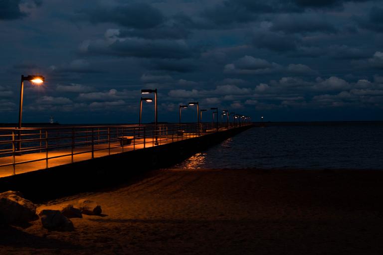 Keywords: pier ocean sunset landscape sea coast dusk twilight evening silhouettes shadows clouds reflection seascape scenic illuminated water lights wood beach sand