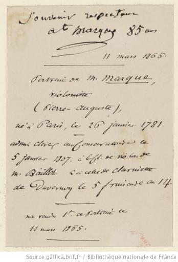 | Keywords: Pierre-Auguste Marque, verso NB.jpeg portrait de Pierre Auguste Marque 1781-1868 daté de 1865 Document en couleur 2014-06-01 11 34 02 http //catalogue bnf fr/ark /12148/cb396212554 Bnf/Gallica ark /12148/btv1b8422287v S n Public domain PD-old-auto Uploaded with UploadWizard Violinists from France Joseph Boulogne de Saint-George |