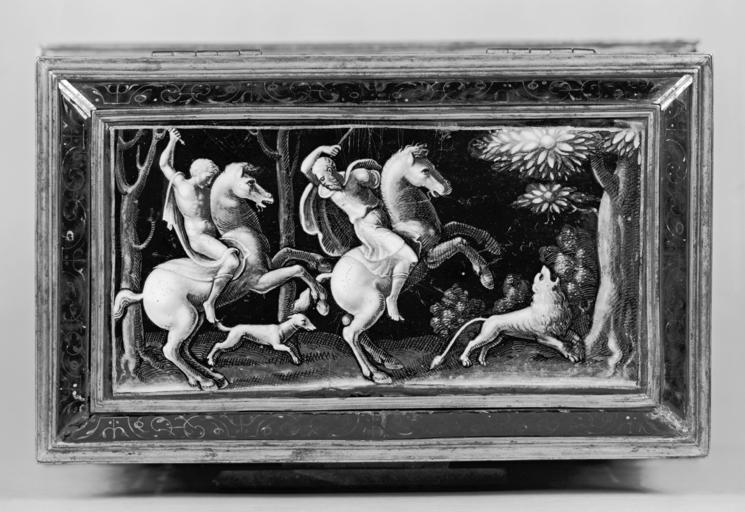 | Keywords: Pierre Reymond - Casket with Scenes of Ancient Lion Hunts - Walters 44135.jpg Such caskets for storing personal items and treasures were often decorated with romantic scenes from ancient mythology or an imagined past The subject of the lion hunt was found on Roman sarcophagi but made accessible for artists through Renaissance prints Reymond must have never seen lions which here look like pesky dogs A mythical unicorn is featured on a side panel The clear black contours reflect Reymond's reliance on prints for his designs but the lively rendering of surfaces is his own Another version of this casket present location unknown is signed and dated 1547 ca 1547 Renaissance gilt on painted enamel gilded brass Overall cm 14 23 3 ; Top front and back plaques cm 8 9 17 1 ; End plaques cm 8 9 8 4 accession number 44 135 8489 possibly from the Rattier and Beurdeley Collections Charles Mannheim date and mode of acquisition unknown catalogue by E Molinier p 29 no 180 J Pierpont Morgan New York no 765 Arnold Seligmann Rey and Co New York date and mode of acquisition unknown Henry Walters city Baltimore Walters Art Museum Henry Walters Acquired by Henry Walters 1919 place of origin Limoges France Walters Art Museum license Limoges painted enamels in the Walters Art Museum Pierre Reymond Media contributed by the Walters Art Museum needs category review Painted enamel art in the Walters Art Museum |