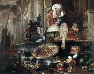 | Keywords: Pieter Boel - Large Vanitas (Still-Life).JPG Artwork Still-life creator Pieter Boel 1663 oil canvas 207 x 260 cm Still life own user Andreagrossmann credit line Other versions PD-old-100 Pieter Boel Paintings of Vanitas 1663 paintings Oil still life paintings Flemish paintings in the Palais des Beaux-Arts de Lille Boel ImageNote 1 489 35 105 131 1051 828 2 langswitch Schädel mit Lorbeer Skull in laurel ImageNoteEnd 1 ImageNote 2 648 226 139 208 1051 828 2 langswitch päpstliche Tiara Papal tiara ImageNoteEnd 2 ImageNote 3 576 621 175 106 1051 828 2 langswitch Palette mit Pinseln Palette with brushes ImageNoteEnd 3 ImageNote 4 159 491 204 155 1051 828 2 langswitch Sarkophag Sarcophagus ImageNoteEnd 4 ImageNote 5 551 116 185 166 1051 828 2 langswitch Hermelinmantel Ermine coat ImageNoteEnd 5 ImageNote 6 602 12 98 98 1051 828 2 Turban ImageNoteEnd 6 ImageNote 7 384 498 255 149 1051 828 2 Langswitch goldgeschmiedete Schlüssel mit mythologischen Szenen unglücklicher Liebe Gold-smith bowl with mythological scenes about unhappy love ImageNoteEnd 7 ImageNote 8 347 704 122 86 1051 828 2 Tambourine ImageNoteEnd 8 ImageNote 9 559 753 203 73 1051 828 2 langswitch Säbel Sabre ImageNoteEnd 9 ImageNote 10 240 70 83 317 1051 828 2 langswitch trauernde Frau Mourning woman ImageNoteEnd 10 Crowns in art 1660s still life paintings |