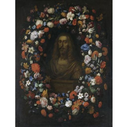 Keywords: Pieter Thijs - Leopold of Austria in flower garland ca1650.jpg Artwork creator Pieter Thijs portrait <br><br> unknown <br> flower garland 1650-1662 oil canvas in Grisaille cm 147 5 114 7 Private collection accession number object history credit line inscribed on the base of the statue CAESAR ISOLA PALMA LEOPDO TRIVMPLIS LAVREA / OBSDEOLIS GRAMINEA VICTRIX OLEAGINA/ MVRALIS POPVLEA OVALIS MYRTEA / CIVICA QVERNA HEDERACEA TANDEM/ IN VNAM FLORVERVNT/ CORONE http //www sothebys com/app/live/lot/LotDetail jsp lot_id 159306789 Sotheby's auction 2006;http //www rkd nl/rkddb/dispatcher aspx action search database ChoiceImages search priref 191493 RKD PD-old-100 Archduke Leopold Wilhelm of Austria Portraits with garland of flowers frame Pieter Thijs Images from Sotheby's |