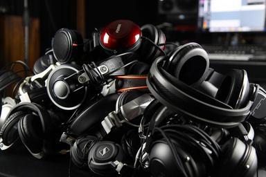 Keywords: pile headphones studio recording stack audio music entertainment stereo equipment sound