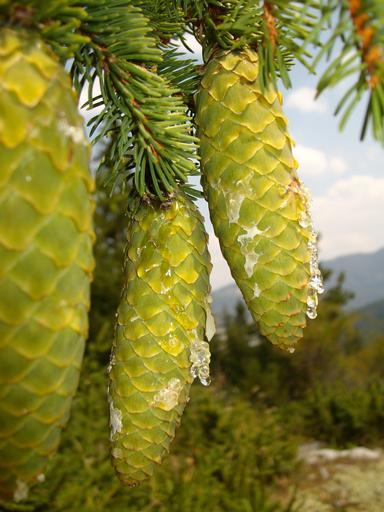 Keywords: pine cones green mountain tree organic agriculture outdoors environment trunk leaves branches nature woodland forest