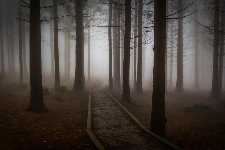 Keywords: pine forest forest road misty mystic pine wood nature critter fog winter trees fearful spooky frightening