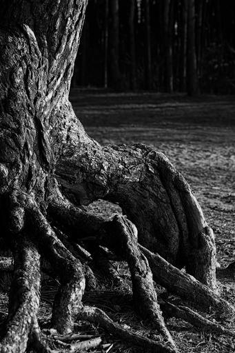 Keywords: pine trunk the roots of the trees nature the bark tree trunks bent tree distorted stock landscape photo black and white contrast light key nightmare horror movie view forest