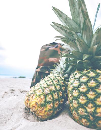 Keywords: pineapples beach backpack picnic leisure fruit sweet snack tropical summer sea vacation holiday exotic food sand
