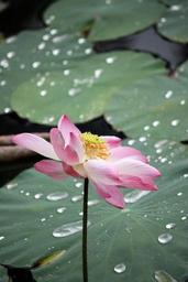 Keywords: pink lotus flowers blooms blossoms blooming aquatic water plants flowering floating green leaves round leafy dew droplets fresh wet decorative ornamental gardens gardening bright sunny