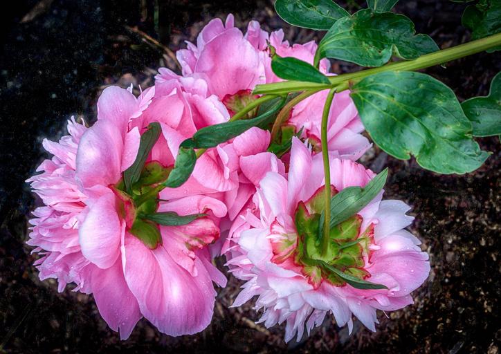 Keywords: pink peony blossoms perennial paeoniaceae spring flowers full bloom hdr pink flowers floral green leaves