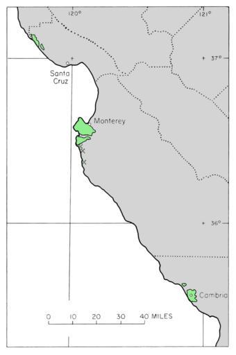 | Keywords: Pinus radiata radiata range map.png en Natural distribution map for Pinus radiata var radiata 1966 http //www biodiversitylibrary org/bibliography/66393 /summary Geographic distribution of the pines of the world Miscellaneous publication no 991 U S Department of Agriculture Forest Service Washington D C February 1966 William B Critchfield Elbert L Little Jr U S Department of Agriculture Forest Service PD-USGov Pinus radiata range maps Uploaded with UploadWizard | ||||