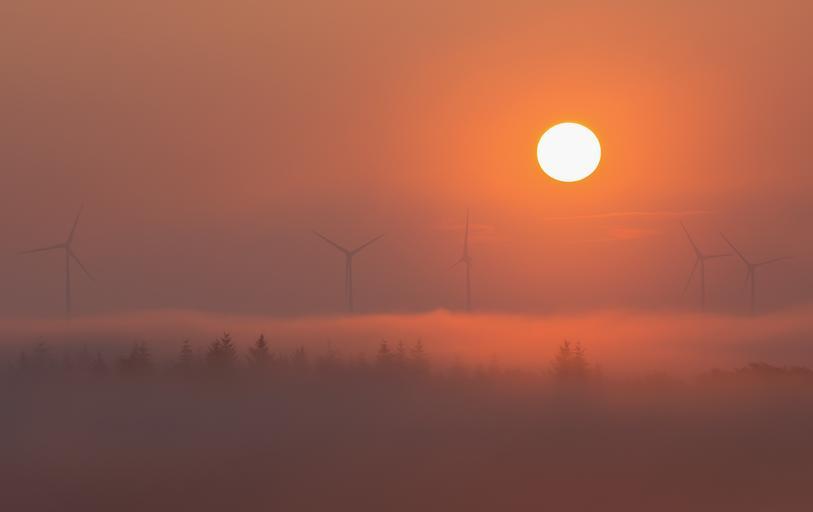 Keywords: pinwheel energy wind power environmental technology sun fog forest morning