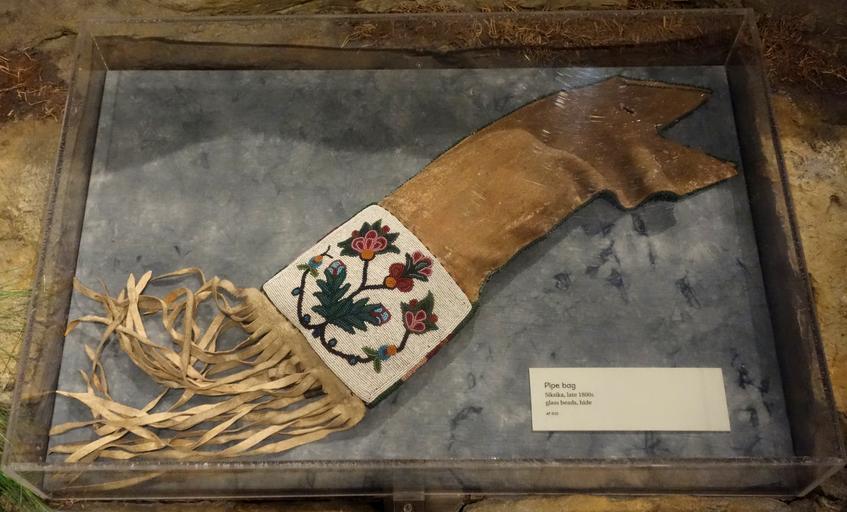 Keywords: Pipe bag, Siksika, late 1800s, glass beads, hide - Glenbow Museum - DSC00984.JPG en Exhibit in the Glenbow Museum 130 9th Ave S E Calgary Alberta Canada This work is old enough so that it is in the public domain Photography was permitted in the museum without restriction 2013-09-21 12 38 37 own Daderot cc-zero Indigenous cultures in the Glenbow Museum Uploaded with UploadWizard Siksika artefacts |