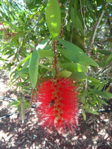 Keywords: pipecleaner bush plant blossom bloom bloom flower filigree leaflets close red exotic ornamental shrub flora garden powder puff shrub