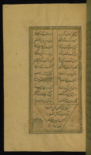 Keywords: Pir 'Ali al-Jami - Colophon - Walters W648166A - Full Page.jpg This folio from Walters manuscript W 648 contains a colophon in Arabic giving the name of the scribe only 10th century AH/AD 16th century Safavid ink pigments laid paper cm 23 5 14 accession number W 648 166A 81308 al-'abd Yar ibn Aq Muhammad 1019 AH/AD 1610-1611 mode of acquisition unknown seal impression on fol 166a Anonymous owner Rajab 1269 AH/AD 1853 mode of acquisition unknown seal impression on fol 4a Henry Walters Baltimore date and mode of acquisition unknown Walters Art Museum Henry Walters Acquired by Henry Walters Transliteration place of origin Iran Walters Art Museum license 2D Epic of Timur by Hatifi Walters MS 648 |