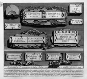 Keywords: Piranesi-2019.jpg 2 2018 2020 XVIII Avanzi della camera Sepolcrale ad uso della plebe nella villa Magnani; cfr Pianta di Roma de Piranesi no 88 Première ligne à droite L ucius Sepunius / mulieris l ibertus / Faustus ; CIL VI 5921 Deuxième ligne au centre de gauche à droite M arcus Lucceius / M arci l ibertus Eros // V iva Lucceia M arci l iberta / Eutychia ; CIL VI 5912 Troisième ligne à gauche L ucius Aquillius / Cerdo ; CIL VI 5889 à droite Mulria / Hilara ou Mulvia Hilara selon Epigraphik Datenbank ; CIL VI 5914 Quatrième ligne de gauche à droite Iulia C ai l iberta / Eupraxia // L ucius Autronius / L uci l ibertus Athopheutus ; CIL VI 5910 C aius Iulius Augusti l iberti l ibertus / Priamus et / Baebia mulieris l iberta Parhalia / coniunx ; CIL VI 5909 Cinquième ligne de gauche à droite C aius Herennius Apollodonus ou C aius Herennius / Apollodorus selon Epigraphik Datenbank ; CIL VI 5907 C aius Gavius / Sorani l ibertus / Blandus ; CIL VI 5905 P ublius Titienus / Agatho ; CIL VI 5927 C aius Clodius / Triumpus ; CIL VI 5898 Ancient Roman tombs in Rome CIL VI 005921 CIL VI 005912 CIL VI 005889 CIL VI 005914 CIL VI 005910 CIL VI 005909 CIL VI 005907 CIL VI 005905 CIL VI 005927 CIL VI 005898 |