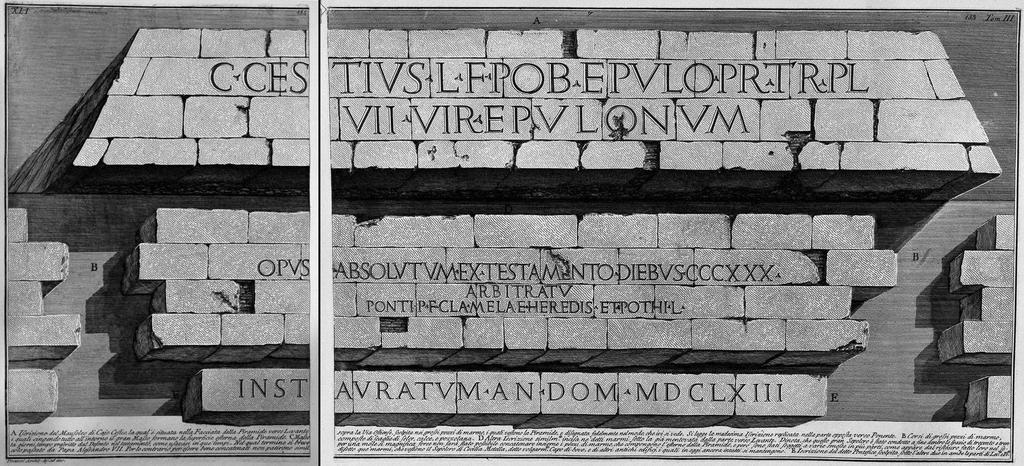 | Keywords: Piranesi-3-41.jpg 3 3-40 3-42 XLI Inscriptions on the pyramid of Caius Cestius <gallery> File Piranesi-3042 jpg File Piranesi-3041 jpg </gallery> ru <br> A «Гай Цестий Эпулон сын Люция п ето т ибун плебса septemvir epulonum» - надпись на авзолее Цестия помещенная на фасаде Пи амиды об ащенном к востоку к Остийской до оге вы езанной на больших блоках из м амо а кото ыми облицована Пи амида Эта же надпись читается на п отивоположенной сто оне об ащенной к западу B Ряд кладки из больших м амо ных блоков кото ые опоясывали яд о пи амиды фо ми уя внешнюю ее пове хность C Яд о составлено из осколок к емня извести и пуццолана D Д угая надпись вы езанная на подобного ода м амо ных блоках имеется только на сто оне об ащенной к востоку Она указывает на то что эта большая г обница была закончена за 330 дней как было п едписано в завещании обычном для того в емени В ее конце не хватает куска это означает что хотя и не было возможности сцепить вместе блоки из м амо а составляющие внешнюю пове хность Пи амиды все же большая часть из них была пе едвинута п и естав ации п оведенной в п ошлом веке Папой Александ ом VII E адпись высеченная Папой на обеих об ащенных к востоку и западу сто онах пи амиды Aurelian Walls in art 1756 Pyramid of Caius Cestius Rome in art 1756 18th-century images of Rome Pyramid 1700s Engravings of cities Rome Etchings by Giovanni Battista Piranesi Le antichità Romane Piranesi Piranesi-3041 |
