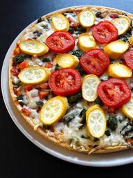 Keywords: pizza vegetarian delicious cheese tomatoes zucchini about eat food lunch color dough brown