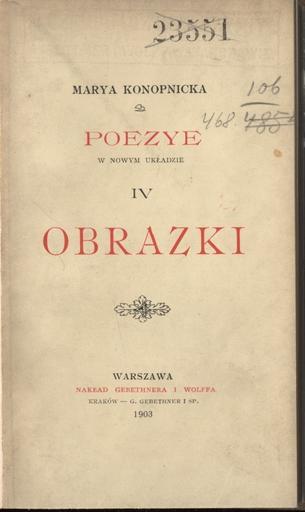 Keywords: PL Marya Konopnicka-Poezye w nowym układzie IV Obrazki 005.jpeg en book pl książka http //www polona pl/dlibra/doccontent2 id 8800 Cyfrowa Biblioteka Narodowa Creator Maria Konopnicka Poezye w nowym układzie Obrazki Series title IV Gebethner i Wolff W L Anczyc i Spółka 1903 Warsaw pl PD-old-100 Poezye w nowym układzie Tom IV Obrazki |
