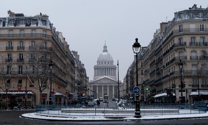 Keywords: winter snow street building Place Edmond Rostand Pantheon France