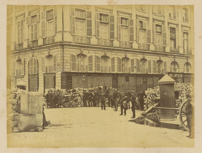 | Keywords: Place Vendôme; Barricade in the Rue Castiglione WDL1273.png Artwork ru Б аквейе Б уно 1823 1875 гг fr Braquehais Bruno 1823-1875 en Braquehais Bruno 1823-1875 zh 布鲁诺·布拉奇海 ,1823-1875 年 pt Braquehais Bruno 1823-1875 ar براكهيه برونو، 1823-1875 es Braquehais Bruno 1823-1875 ru Вандомская площадь; ба икада на улице Кастильоне fr Place Vendôme barricade de la rue de Castiglione en Place Vendôme; Barricade in the Rue Castiglione zh 旺多姆广 ;卡斯堤拉恩街的防御工事 pt Praça Vendôme; barricada em Rue Castiglione ar ميدان فندوم؛ متراس في شارع كاستيليون ru П ичиной ф анко-п усской войны стал ост нап яженности в отношениях между Ф анцией и П уссией в 1860-х гг Ф анция п и импе ато е аполеоне III была полна ешимости п ове ить астущую силу П уссии и отомстить за то что она ассмат ивала как яд дипломатических унижений П уссия п и канцле е Отто фон Бисма ке считала что война ге манских госуда ств п отив Ф анции под уководством П уссии станет ешающим шагом к созданию единой Ге манской импе ии Конфликт начался 19 июля 1870 г когда Ф анция объявила войну Ф анцузская а мия оказалась ужасно неподготовленной и поте пела сок ушительное по ажение в битве п и Седане отк ыв до огу на Па иж К 19 сентяб я немцкие войска полностью ок ужили го од и начали осаду кото ая п одлилась более четы ех месяцев От езанные от поставок п одовольствия из сельской местности па ижане пытались выжить питаясь собаками кошками и даже животными из па ижского зоопа ка Де евья на Елисейских полях и в па ках были вы ублены и использованы в качестве топлива 5 янва я немецкие войска начали бомба ди овку го ода кото ая п одолжалась по несколько часов каждую ночь в течение 23 суток а ок естности Па ижа было сб ошено около 12 000 сна ядов кото ые убили около 400 человек Па иж сдался 28 янва я в сущности положив конец войне За по ажением ф анцузов последовало на одное восстание и установление в а те 1871г Па ижской коммуны еволюционного п авительства сфо ми ованного в соответствии с ана хистскими и социалистическими п инципами Коммуна была жестоко подавлена в мае 1871 г ф анцузскими войсками п авительства Адольфа Тье а Во в емя неп одолжительного конт оля над Па ижем коммуна ы аз ушали импе ато скую колонну на Вандомской площади Подавление коммуны п ивело к дальнейшим значительным аз ушениям в го оде когда коммуна ы подожгли дво ец Тюиль и Лув и д угие здания К оме того многие здания пост адали или были аз ушены во в емя отчаянной пе ест елки между коммуна ами и конт еволюционными силами Siege de Paris 1870 1871 Осада Па ижа 1870 1871 гг п едставляет собой альбом из 110 фотог афий сделанных Огюстом Б уно Б аквейе 1823 1875 гг ф анцузским фотог афом и п ог ессивным фотожу налистом документи овавшим осаду и последствия бомба ди овок а также аз ушения п оизошедшие во в емя Па ижской коммуны <br>Ба икады; Пушки; Ф анко-п усская война 1870 1871 гг ; Память ми а; Вандомская площадь Па иж Ф анция ; Площади; Улица Кастильоне Па иж Ф анция ; Солдаты fr La guerre franco-allemande fut provoquée par l escalade des tensions entre la France et la Prusse dans les années 1860 La France sous l empereur Napoléon III était déterminée à contenir la croissance de la puissance prussienne et à venger ce qui était considéré comme une série d humiliations diplomatiques La Prusse sous le chancelier Otto von Bismarck considérait qu une guerre dirigée par la Prusse et menée par les États allemands contre la France serait un acte décisif menant à la création d un empire allemand unifié Le conflit débuta le 19 juillet 1870 jour où la France déclara la guerre L armée française s avéra terriblement mal préparée et subit une défaite désastreuse lors de la bataille de Sedan laissant la voie libre vers Paris Le 19 septembre les Allemands encerclèrent complètement la ville et commencèrent un siège qui allait durer plus de quatre mois Coupés du ravitaillement provenant de la campagne les Parisiens survécurent en mangeant les chiens les chats et même la plupart des animaux du zoo de Paris Les arbr