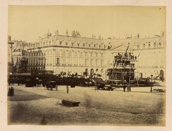 Keywords: Place Vendôme. The First Red Flag, after the Fall of the Column WDL1285.png Artwork ru Б аквейе Б уно 1823 1875 гг fr Braquehais Bruno 1823-1875 en Braquehais Bruno 1823-1875 zh 布鲁诺·布拉奇海 ,1823-1875 年 pt Braquehais Bruno 1823-1875 ar براكهيه برونو، 1823-1875 es Braquehais Bruno 1823-1875 ru Вандомская площадь Пе вый к асный флаг после падения колонны fr Place Vendôme Le premier drapeau rouge après la chute de la colonne en Place Vendôme The First Red Flag after the Fall of the Column zh 旺多姆广 旺多姆 柱 下后的第 红旗 pt Praça Vendôme a primeira bandeira vermelha depois da derrubada da coluna ar ميدان فندوم أول علم أحمر، بعد سقوط العمود ru П ичиной ф анко-п усской войны стал ост нап яженности в отношениях между Ф анцией и П уссией в 1860-х гг Ф анция п и импе ато е аполеоне III была полна ешимости п ове ить астущую силу П уссии и отомстить за то что она ассмат ивала как яд дипломатических унижений П уссия п и канцле е Отто фон Бисма ке считала что война ге манских госуда ств п отив Ф анции под уководством П уссии станет ешающим шагом к созданию единой Ге манской импе ии Конфликт начался 19 июля 1870 г когда Ф анция объявила войну Ф анцузская а мия оказалась ужасно неподготовленной и поте пела сок ушительное по ажение в битве п и Седане отк ыв до огу на Па иж К 19 сентяб я немцкие войска полностью ок ужили го од и начали осаду кото ая п одлилась более четы ех месяцев От езанные от поставок п одовольствия из сельской местности па ижане пытались выжить питаясь собаками кошками и даже животными из па ижского зоопа ка Де евья на Елисейских полях и в па ках были вы ублены и использованы в качестве топлива 5 янва я немецкие войска начали бомба ди овку го ода кото ая п одолжалась по несколько часов каждую ночь в течение 23 суток а ок естности Па ижа было сб ошено около 12 000 сна ядов кото ые убили около 400 человек Па иж сдался 28 янва я в сущности положив конец войне За по ажением ф анцузов последовало на одное восстание и установление в а те 1871г Па ижской коммуны еволюционного п авительства сфо ми ованного в соответствии с ана хистскими и социалистическими п инципами Коммуна была жестоко подавлена в мае 1871 г ф анцузскими войсками п авительства Адольфа Тье а Во в емя неп одолжительного конт оля над Па ижем коммуна ы аз ушали импе ато скую колонну на Вандомской площади Подавление коммуны п ивело к дальнейшим значительным аз ушениям в го оде когда коммуна ы подожгли дво ец Тюиль и Лув и д угие здания К оме того многие здания пост адали или были аз ушены во в емя отчаянной пе ест елки между коммуна ами и конт еволюционными силами Siege de Paris 1870 1871 Осада Па ижа 1870 1871 гг п едставляет собой альбом из 110 фотог афий сделанных Огюстом Б уно Б аквейе 1823 1875 гг ф анцузским фотог афом и п ог ессивным фотожу налистом документи овавшим осаду и последствия бомба ди овок а также аз ушения п оизошедшие во в емя Па ижской коммуны <br>Ф анко-п усская война 1870 1871 гг ; Память ми а; Вандомская площадь Па иж Ф анция ; Площади fr La guerre franco-allemande fut provoquée par l escalade des tensions entre la France et la Prusse dans les années 1860 La France sous l empereur Napoléon III était déterminée à contenir la croissance de la puissance prussienne et à venger ce qui était considéré comme une série d humiliations diplomatiques La Prusse sous le chancelier Otto von Bismarck considérait qu une guerre dirigée par la Prusse et menée par les États allemands contre la France serait un acte décisif menant à la création d un empire allemand unifié Le conflit débuta le 19 juillet 1870 jour où la France déclara la guerre L armée française s avéra terriblement mal préparée et subit une défaite désastreuse lors de la bataille de Sedan laissant la voie libre vers Paris Le 19 septembre les Allemands encerclèrent complètement la ville et commencèrent un siège qui allait durer plus de quatre mois Coupés du ravitaillement provenant de la campagne les Parisiens survécurent en mangeant les chiens les chats et même la plupart des animaux du zoo de Paris Les a