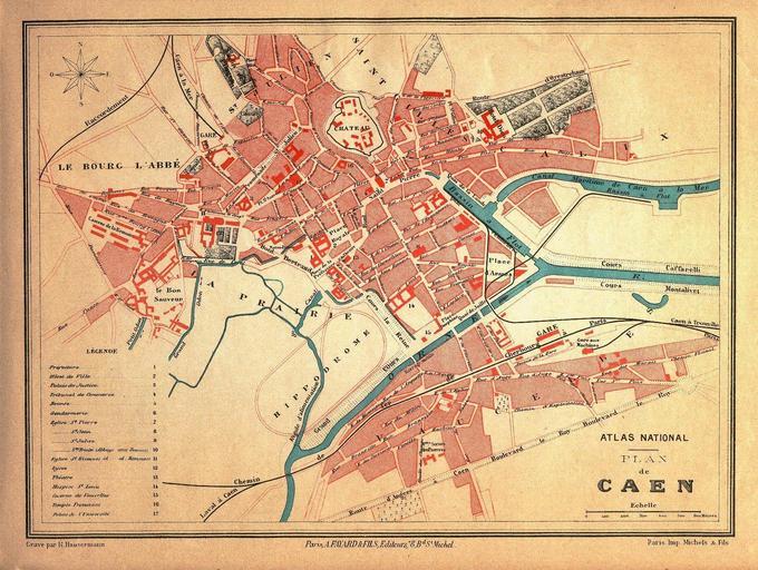 Keywords: Plan 1890environ.jpg Plan de Caen à la Belle-Epoque Propriété personnelle 1896 F de la Brugère in Atlas National Fayard et Fils Paris 1896 PD-old Old maps of Caen 19th century 1890 Caen in the 1890s ImageNote 1 435 469 104 106 1682 1267 2 Lycée Malherbe fondé en 1804 et installé dans l'Abbaye aux Hommes ImageNoteEnd 1 ImageNote 2 273 524 161 232 1682 1267 2 Bon Sauveur hôpital psychiatrique fondé à Vaucelle au XVIII e et transféré au début du XIX e dans l'ancien couvent des Capucins ImageNoteEnd 2 ImageNote 3 158 443 192 131 1682 1267 2 Quartier Lorge base militaire aménagée à partir de 1792 dans l'ancien monastère de la Visitation de Caen et agrandi au XIX e ImageNoteEnd 3 ImageNote 4 554 680 315 306 1682 1267 2 Hippodrome de la Prairie champs de course ouvert dans les années 1830 ImageNoteEnd 4 ImageNote 5 1179 718 93 74 1682 1267 2 Gare de Caen gare ouverte en 1857 sur la ligne Paris-Caen prolongée jusqu'à Cherbourg en 1858 ImageNoteEnd 5 ImageNote 6 907 695 89 70 1682 1267 2 Caserne Hamelin construite dans la deuxième partie du XVIII e ImageNoteEnd 6 ImageNote 7 835 631 150 116 1682 1267 2 Hospice Saint-Louis ancien Hôpital général fondé au milieu du XVII e ImageNoteEnd 7 ImageNote 8 1057 141 283 194 1682 1267 2 Hôtel-Dieu transféré en 1823 dans l'ancienne abbaye aux Dames ImageNoteEnd 8 ImageNote 9 478 294 30 23 1682 1267 2 Gare de Caen Saint-Martin à l'origine simple embarcadère servant de tête de ligne de Caen à la mer Le bâtiment voyageurs est construit en 1884 ImageNoteEnd 9 ImageNote 10 513 431 57 46 1682 1267 2 Palais de justice de Caen construit dans la première partie du XIX e à partir de plans dressés par Armand Lefebvre ingénieur des ponts et chaussées de la généralité de Caen en 1779 ImageNoteEnd 10 ImageNote 11 378 484 63 53 1682 1267 2 Monastère des Visitandines installé dans l'ancien logis abbatial de l'abbaye aux Hommes à partir de 1810 ImageNoteEnd 11 ImageNote 12 670 547 57 53 1682 1267 2 Hôtel de la Préfecture construit dans la première partie du XIX e ImageNoteEnd 12 ImageNote 13 448 321 89 63 1682 1267 2 Académie d'équitation école de dressage fondée en 1728 par Pierre des Brosses de La Guérinière reconstruite par Gustave Auvray de 1863 à 1866 ImageNoteEnd 13 ImageNote 14 756 562 30 25 1682 1267 2 Théâtre de Caen construit en 1838 et rénové en 1879 ImageNoteEnd 14 ImageNote 15 680 511 66 65 1682 1267 2 Ancien séminaire des Eudistes dans lequel sont installés l'hôtel de ville le musée-école des Beaux-Arts la bibliothèque et l'hôtel des postes ImageNoteEnd 15 ImageNote 16 1065 697 82 87 1682 1267 2 Abattoirs construits en 1855 pour remplacer la halle de la boucherie située en centre-ville ImageNoteEnd 16 ImageNote 17 900 781 38 36 1682 1267 2 Barrage-passerelle barrage à aiguilles mobiles système Poirée construit en 1873-1874 ImageNoteEnd 17 ImageNote 18 989 720 40 32 1682 1267 2 Pont de Vaucelle ancien pont Frileux reconstruit en 1825 ImageNoteEnd 18 ImageNote 19 1050 684 32 27 1682 1267 2 Pont des Abattoirs pont ferroviaire construit en 1857 pour relier la gare au port de Caen bassin Saint-Pierre ouvert à la circulation générale après la construction d'un nouveau pont ferroviaire en 1873 ImageNoteEnd 19 ImageNote 20 1073 669 36 30 1682 1267 2 Pont ferroviaire construit en 1873 pour relier la gare au port de Caen bassin Saint-Pierre ImageNoteEnd 20 ImageNote 21 1084 862 63 61 1682 1267 2 Cimetière Saint-Jean aménagé dans une ancienne carrière à partir de la fin du XVIII e pour accueillir les morts de la paroisse Saint-Jean ImageNoteEnd 21 ImageNote 22 1314 777 89 51 1682 1267 2 Usine à gaz ImageNoteEnd 22 ImageNote 23 809 1079 148 89 1682 1267 2 Cimetière de Vaucelles agrandi à la fin du XIX e ImageNoteEnd 23 ImageNote 24 1236 828 61 38 1682 1267 2 Couvent des Capucins aménagé dans les anciens locaux du Bon Sauveur ImageNoteEnd 24 ImageNote 25 898 422 106 76 1682 1267 2 Couvent de la Charité fondé par Jean Eudes au milieu du XVII e Le pensionnat dépendant du couvent est installé l'ancien palais des évêques de Bayeux partir de 1858 ImageNoteEnd 25 ImageNote 26 803 412 32 25 1682 1267 2 Tribunal de commerce installé dans l'ancien hôtel d'Escoville ImageNoteEnd 26 ImageNote 27 894 374 51 23 1682 1267 2 Poissonnerie ImageNoteEnd 27 ImageNote 28 854 382 51 25 1682 1267 2 Marché couvert ImageNoteEnd 28 ImageNote 29 742 346 36 32 1682 1267 2 Temple protestant aménagé au début du XIX e dans une dépendance de l'ancien couvent des Bénédictines ImageNoteEnd 29 ImageNote 30 617 306 66 61 1682 1267 2 Couvent des Bénédictines installé dans l'ancien couvent des Cordeliers ImageNoteEnd 30 ImageNote 31 630 380 51 36 1682 1267 2 Palais de l'Université construit au début du XVIII e et agrandi en 1875-1894 et en 1803 ImageNoteEnd 31 ImageNote 32 594 380 44 34 1682 1267 2 Couvent des Ursulines ImageNoteEnd 32 ImageNote 33 604 403 40 34 1682 1267 2 Halle aux grains dans l'ancienne église Saint-Sauveur ImageNoteEnd 33 ImageNote 34 568 519 66 32 1682 1267 2 Ancien collège du Mont siège de l'inspection académique et musée de la société des antiquaires de Normandie ImageNoteEnd 34 ImageNote 35 710 201 156 152 1682 1267 2 Château de Caen dans lequel est construite la caserne Lefebvre à partir de 1876 ImageNoteEnd 35 ImageNote 36 437 70 144 154 1682 1267 2 Jardin des plantes jardin botanique ouvert en 1736 appartenant à l'université puis au préfet et enfin à la municipalité ImageNoteEnd 36 ImageNote 37 513 224 80 61 1682 1267 2 Cimetière des Quatre-Nations ouvert à la fin du XVIII e pour accueillir les morts de quatre paroisse du centre-ville ImageNoteEnd 37 ImageNote 38 896 63 99 112 1682 1267 2 Cimetière Saint-Pierre ouvert à la fin du XVIII e pour accueillir les morts de la paroisse Saint-Pierre ImageNoteEnd 38 ImageNote 39 999 534 55 57 1682 1267 2 Couvent de la Miséricorde ImageNoteEnd 39 ImageNote 40 716 583 59 55 1682 1267 2 Gendarmerie ImageNoteEnd 40 Im