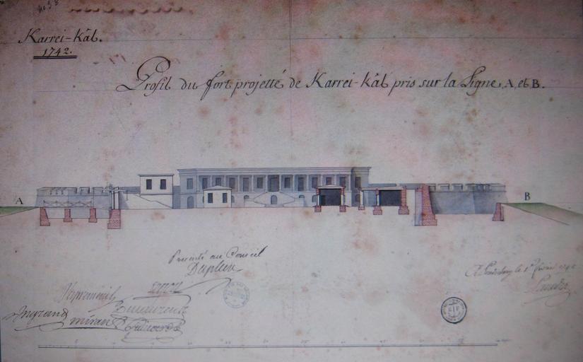 | Keywords: Plan of Fort St-Louis Karikal 1742.jpg en A sketch of the planned Fort St-Louis at Karikal Karrei-Kâl viewed in profile There is an annotation by François Dupleix who had been named governor-general of the French East India Company's settlements in India in 1742 the year that sketch was drawn The French who had been trading at Karikal since the late 17th century had acquired the town and area in 1738 1742 Base Uysse Archives nationales d'outre-mer France French military engineer 1742 other versions PD-old-100 Uploaded with UploadWizard Historical images of Karaikal |