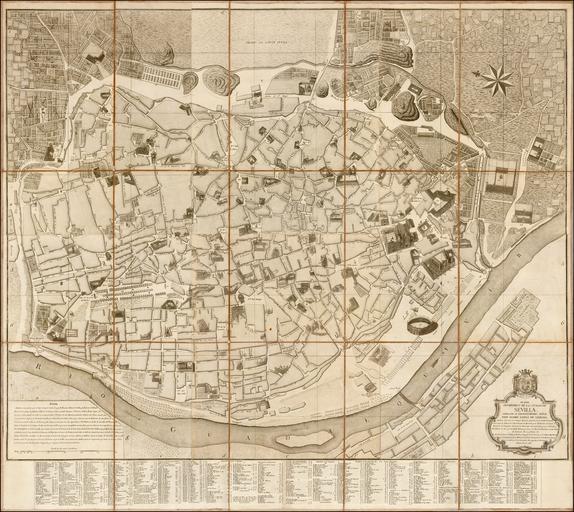 | Keywords: Plano Geométrico De La Ciudad De Sevilla, por Juan López.jpg en Finely executed large format plan of Sevilla publshed by Spain's leading mapmaker of the late 18th Century Juan Lopez The map provides an exceptionally detailed look at Sevill'a old town including dozens of profile views of major buildings which are located in the key below the map The map pre-dates by 12 years the yellow fever epidemic which killed nearly a third of Sevilla's population Sevilla has been one of the most important cities in Spain since ancient times The first settlers of the site have been identified with the Tartessian culture The destruction of their settlement is attributed to the Carthaginians giving way to the emergence of the Roman city of Hispalis built very near the Roman colony of Itálica now Santiponce which was only 5 miles northwest of modern Sevilla Under Muslim rule the city became the seat of power in the Caliphate of Cordoba Following the reconquest of Spain from the Moors in 1248 Sevilla became one of the Capital cities of Spain 1788 cm 108 87 6 accession number object history credit line https //www raremaps com/gallery/detail/39455/Plano_Geometrico_De_La_Ciudad_De_Sevilla_Dedicado_al_Excelentisimo_Senor/Lopez html www raremaps com PD-old-100 Old maps of Seville |