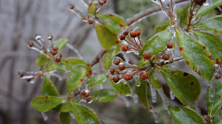 Keywords: plant winter ice frozen thick layer cold season nature closeup detail berries leaves icy frosty covered
