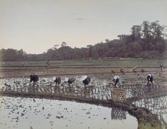 Keywords: Planting rice; Ogawa Kazumasa.jpg Planting rice Japan 19th century http //oldphoto lb nagasaki-u ac jp/en/target php id 412 Nagasaki University Library; Japanese Old Photographs in Bakumatsu Meiji Period Accessed 15 December 2007 century 19 Creator Ogawa Kazumasa PD-old Photographic Views of Japan with Historical and Descriptive Notes Photographs by Ogawa Kazumasa Paddy fields in Japan |