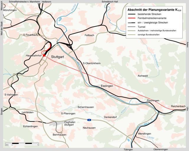 MAKE A MEME View Large Image Planungsvariante K12-5.png en A map of the variant K 12 5 for a Stuttgart-Ulm high-speed railway line A ~20 km tunnel between Stuttgart and the area of Plochingen with a four-track station underneath a 16-track terminus to be kept was a key ...
