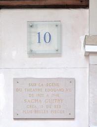 | Keywords: Plaque Sacha Guitry, 10 place Edouard VII.jpg  en Plaque on a wall of the theater Edouard VII where the French writer Sacha Guitry created several of his pieces of theater 10 place Edouard-VII Paris 9th arrond fr Plaque sur un mur du théâtre Edouard VII où Sacha Guitry créa plusieurs de ses pièces 10 place Edouard-VII Paris 9 e arr own Tangopaso 2011-05-10 48 52 16 49 N 2 19 45 5 E region FR_heading NE Sacha Guitry Place Édouard-VII Paris Plaques in Paris 9e arrondissement Plaques referencing 1920 Plaques referencing 1948 Here-worked plaques in Paris 10 house number House numbers in Paris 010 Signs in Paris 9e arrondissement |