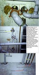 | Keywords: Plastic pipe firestops nortown casitas.jpg  Nortown Casitas Toronto North York Ontario Canada April 1995 Plastic Pipe and Metal Pipe Penetrations being firestopped The plumber had used all 4 diameter sheet metal cans to form the openings The annuli for 2 and 3 piping were therefore oversized Firestop Mortar was used to narrow the annuli Intumescent collars were inverted inside the firestops The intumescent wrap strips were made of 3M's FS195 The mortar was 3M Fire Barrier Mortar The expanded FS195 in a fire would choke off the melting plastic pipes Metallic pipes were firestopped with firestop mortar Own 2007-08-21 Achim Hering Plumbing Firestops Firestop mortar Plastics Intumescents 3M Fire Barrier Mortar |