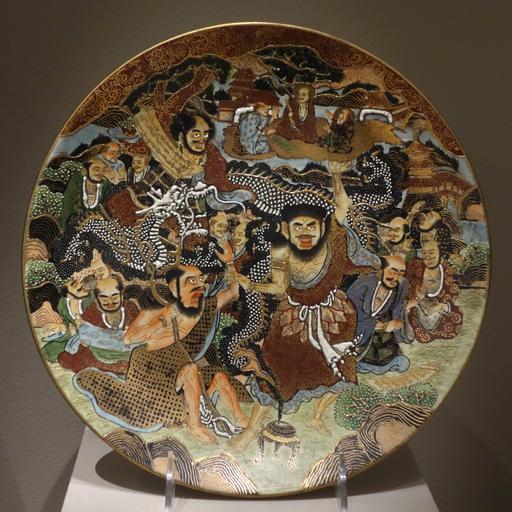 Keywords: Plate, Japan (Kyoto), Choshuzan workshop, decorated by Jissei after a design by Yoshisada, undated, earthenware with overglaze, gold, and white enamel - Chazen Museum of Art - DSC02418.JPG en Exhibit in the Chazen Museum of Art University of Wisconsin-Madison Madison Wisconsin USA This artwork is old enough so that it is in the public domain Photography was permitted in the museum without restriction 2013-07-21 14 04 47 own Daderot cc-zero Ceramics of Japan in the Chazen Museum of Art Uploaded with UploadWizard Choshuzan ware |