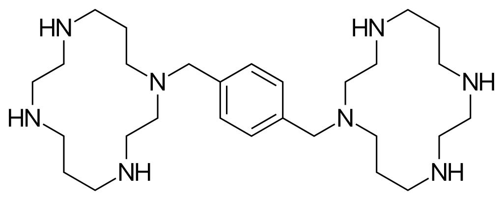 | Keywords: Plerixafor.svg  Skeletal formula of plerixafor IUPAC name 1- 4- 1 4 8 11-tetrazacyclotetradec-1-ylmethyl phenylmethyl -1 4 8 11-tetrazacyclotetradecane Created using http //www acdlabs com/download/chemsk html ACD/ChemSketch 10 0 and Inkscape Own 2007-03-04 Fvasconcellos Plerixafor |
