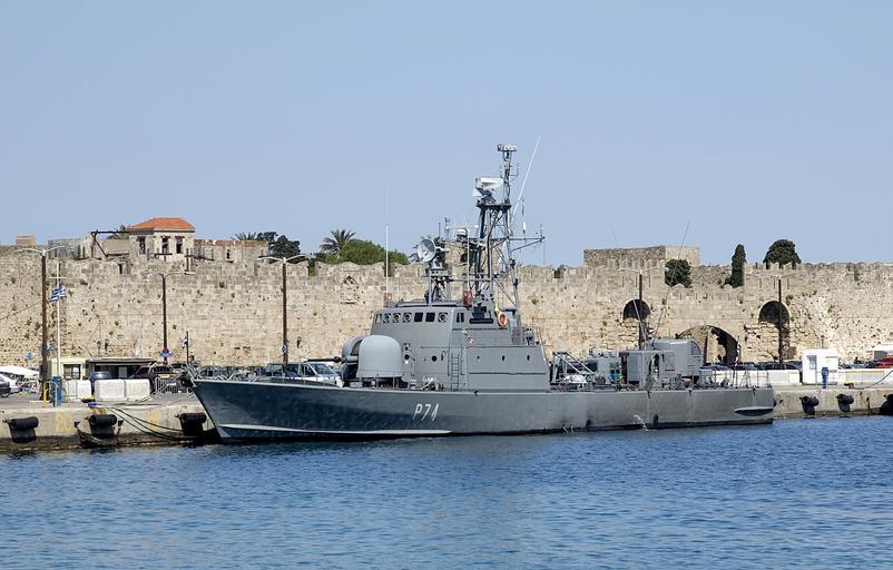 Keywords: Plotarhis Vlakavas P 74.jpg La Combattante IIa-class FACM Guided-Missile Patrol Craft PTG of the Hellenic Navy harbour of Rhodes island of Rhodes Greece fr le Plotarhis Vlakavas P 74 ex-Marder navire de patrouille lance-missiles de la marine grecque port de Rhodes île de Rhodes Grèce D 234 tons 264 fl S 35 8 kts Dim 47 0 45 9 pp x 7 1 x 2 66 fl A 8 RGM-84A Harpoon SSM 1 76-mm 62-cal OTO Melara DP; 1 40-mm 70-cal Bofors AA; 8 mines in place of the 40-mm AA Electronics Radar 1 SMA 3RM 20 nav ; 1 Thales Triton-G air/surf search; 1 Thales Castor-II f c EW Thales DR-2000 intercept; 2 6-round Buck-Wegmann Hot Dog decoy RL; Wolke chaff dispenser M 4 MTU MD 872 16-cyl diesels; 4 props; 14 000 bhp at 1 515 rpm; 12 000 sust Electric 270 kw tot Range 570/30; 1 600/15 Fuel 39 tons Crew 5 officers 37 enlisted Remarks Ordered 18-12-70 as CMN's Combattante II A4L type Design by Friedrich Lürssen Werft Vegesack Fitted out at Cherbourg Transferred from german service 16-3-95 Recommissioned on 30-5-95 Combat systems Harpoon missiles controlled by the SWG-1 V 32 launch system were substituted after delivery to Greece http //books google fr/books id TJunjRvplU4C pg PA268 lpg PA268 dq vlakavas source bl ots wLi-stl3YE sig rfwgpVYBRgt9SEGFEoJXTVNwuqc hl fr ei 3JK0TeaiNtG38gO8t8GWDA sa X oi book_result ct result resnum 2 ved 0CCIQ6AEwAQ v onepage q vlakavas f false info source own Jebulon 2011-04-13 36 26 43 7 N 28 13 43 3 E Ships in Rhodes Fast Attack Craft of Greece Tiger class patrol boat 2011 in Rhodes Quality images by Jebulon Kolona Harbour Rhodes Cc-zero QualityImage |