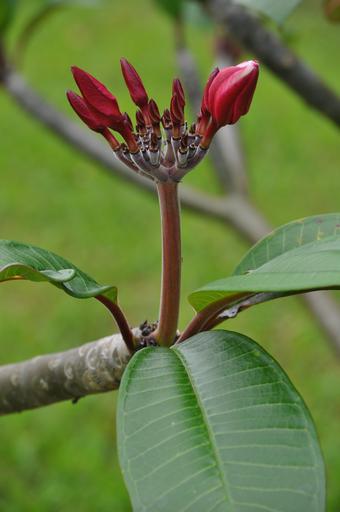 Keywords: plumeria buds pink red flowers floral shoots branches stems plants blooms blooming closed petals fragrant fragrance scent green leaves leafy green backgrounds tropical flowering exotic hawaiian gardens gardening