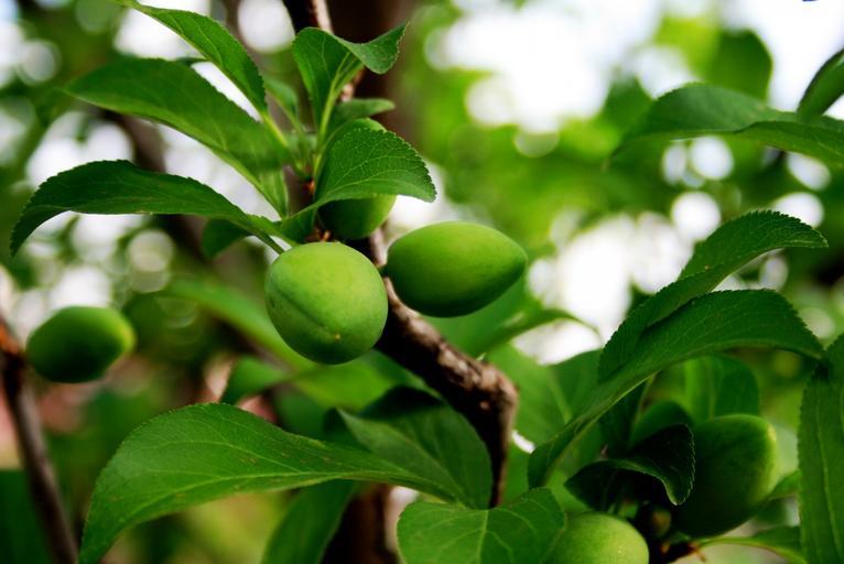 Keywords: plums rounded pointed green shiny young growing twigs foliage dense garden