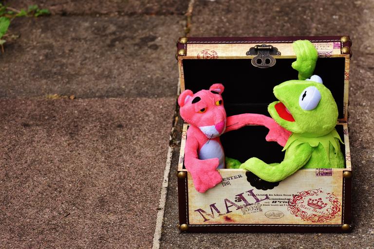 Keywords: plush toys kermit the pink panther toys box chest suitcase fun funny play stuffed animal children fun fig plush frog panther travel go away holiday