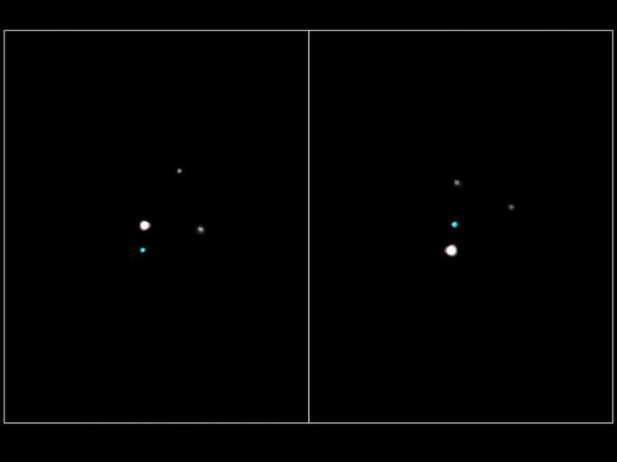| Keywords: Pluto system 2005 discovery images (dumb version).jpg Discovery images of Plutonian satellites P1 and P2 The enhanced-color images of Pluto the brightest object and Charon to the right of Pluto were constructed by combining short exposure images taken in filters near 475 nanometers blue and 555 nanometers green-yellow The images of the new satellites were made from longer exposures taken in a single filter centered near 606 nanometers yellow so no color information is available for them Photo prise par Hubble de la découverte de satellites plutonien P1 et P2 Pluton objet le plus brillant en jaune Charon à droite de Pluton en bleu et les nouveaux satellites en gris http //imgsrc hubblesite org/hu/db/2005/19/images/a/formats/web_print jpg 2010-04-19 NASA ESA H Weaver JHU/APL A Stern SwRI and the Hubble Space Telescope Pluto Companion Search Team user Medium69/old PD-USGov-NASA cc-by-sa-2 0-fr <gallery> Image Pluto system 2005 discovery images jpg en Image Pluto system 2005 discovery images french jpg fr </gallery> Moons of Pluto Photos of Pluto system by Hubble Schemes in virgin Old version of an images by Medium69 |
