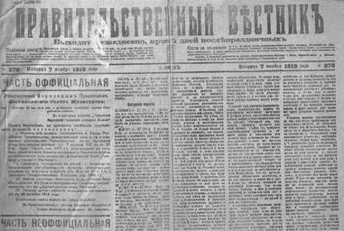 | Keywords: Правительственный вестник.PNG  ru Ф агмент титульного листа газеты П авительственный вестник 1919-11-07 Официальный о ган В еменного Сиби ского П авительства П авительственный вестник  276 7 нояб я 1919 год Омск В еменное Сиби ское П авительство Совет  инист ов PD-RusEmpire Newspapers of Russia 1919 Omsk Oblast Newspapers of Russia to be categorised by name |